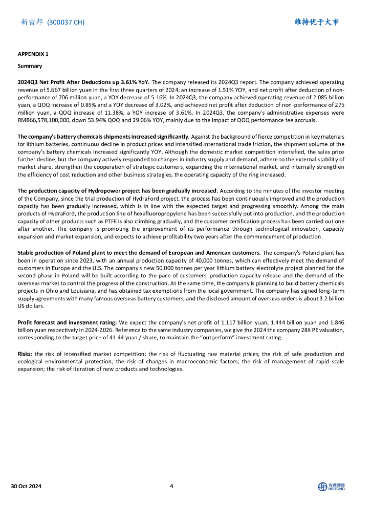 海通国际:新宙邦(300037)-2024Q3扣非后净利润同比增长3.61%,海德福产能逐步提升.pdf