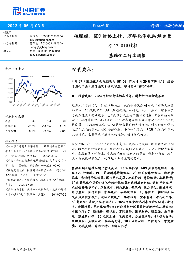 国海证券:基础化工行业周报:碳酸锂、BDO价格上行,万华化学收购烟台巨力47.81%股权.pdf
