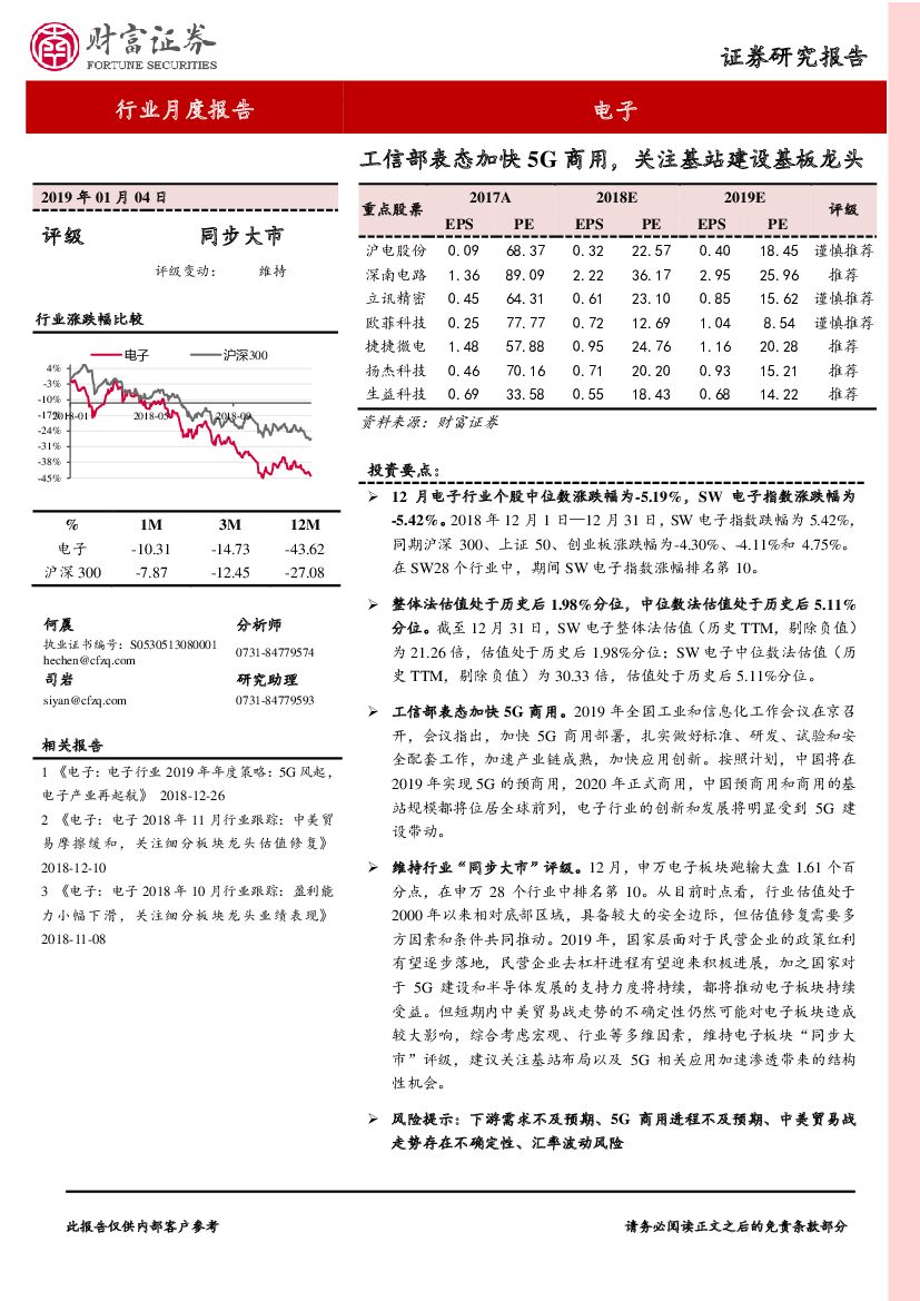 财富证券:电子行业月度报告:工信部表态加快5G商用,关注基站建设基板龙头.pdf