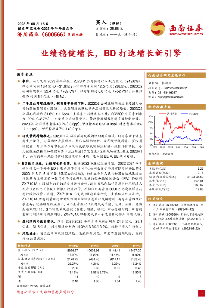 西南证券:济川药业(600566)-业绩稳健增长,BD打造增长新引擎.pdf