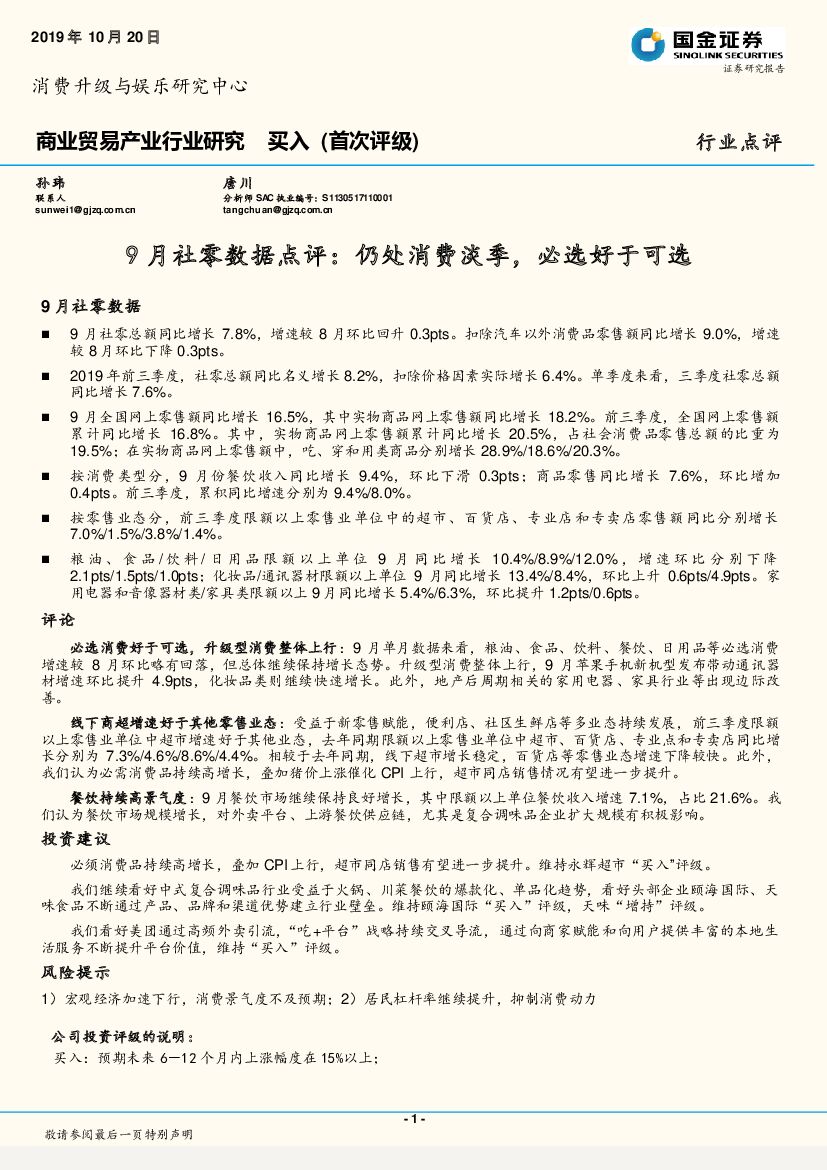 国金证券:商业贸易产业行业研究:9月社零数据点评-仍处消费淡季,必选好于可选.pdf