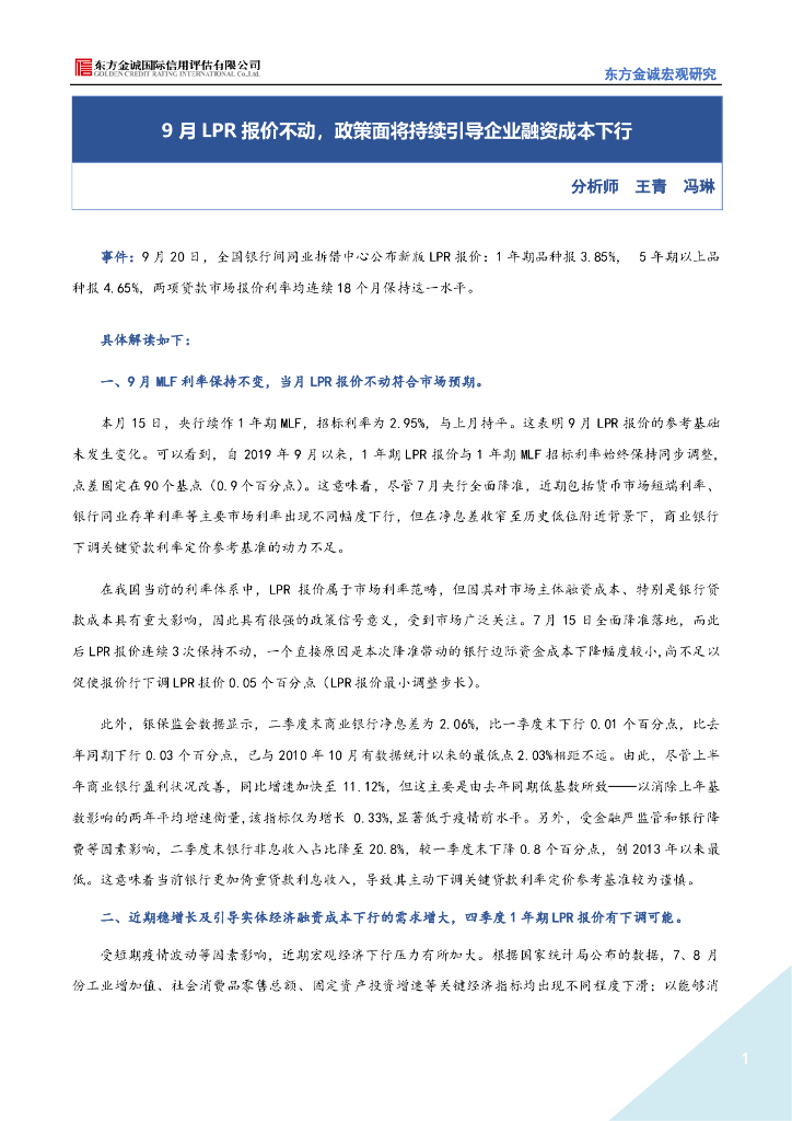 东方金诚:宏观研究 9月LPR报价不动,政策面将持续引导企业融资成本下行-2021年9月LPR报价点评.pdf
