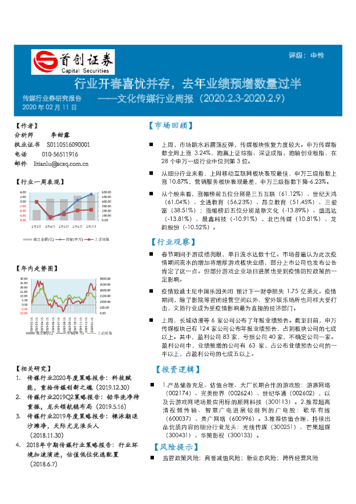 首创证券:文化传媒行业周报:行业开春喜忧并存,去年业绩预增数量过半.pdf