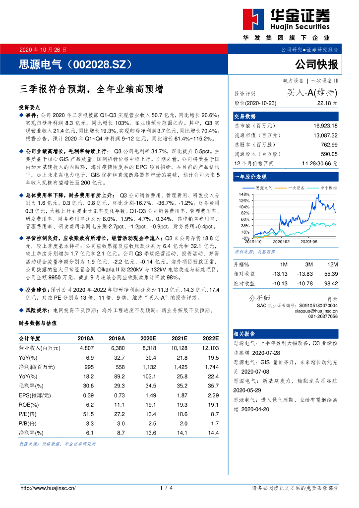 华金证券:思源电气(002028)-三季报符合预期,全年业绩高预增.pdf