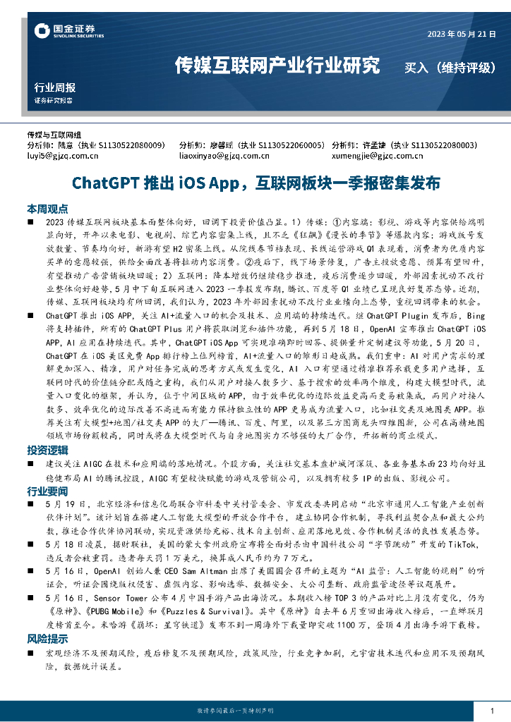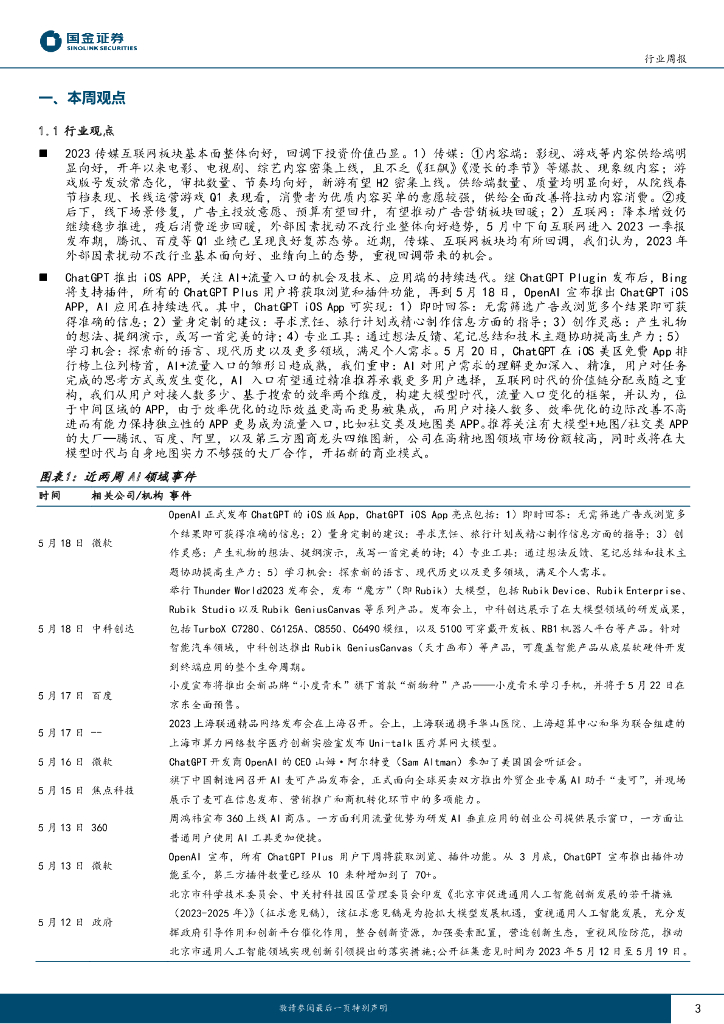 国金证券:传媒互联网产业行业研究:ChatGPT推出iOS App,互联网板块一季报密集发布.pdf