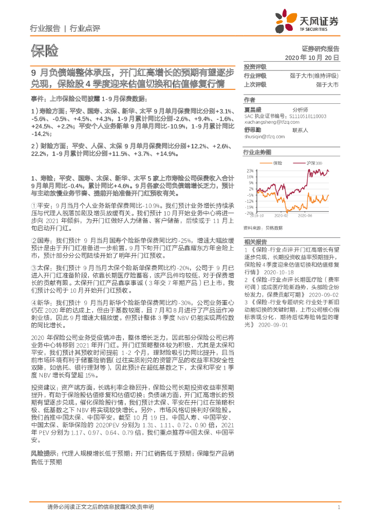 天风证券:保险行业点评:9月负债端整体承压,开门红高增长的预期有望逐步兑现,保险股4季度迎来估值切换和估值修复行情.pdf