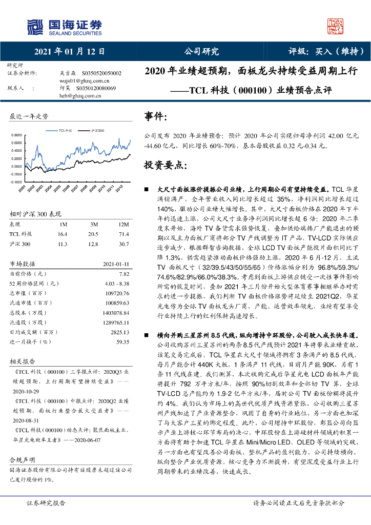 国海证券:TCL科技(000100)-业绩预告点评:2020年业绩超预期,面板龙头持续受益周期上行.pdf