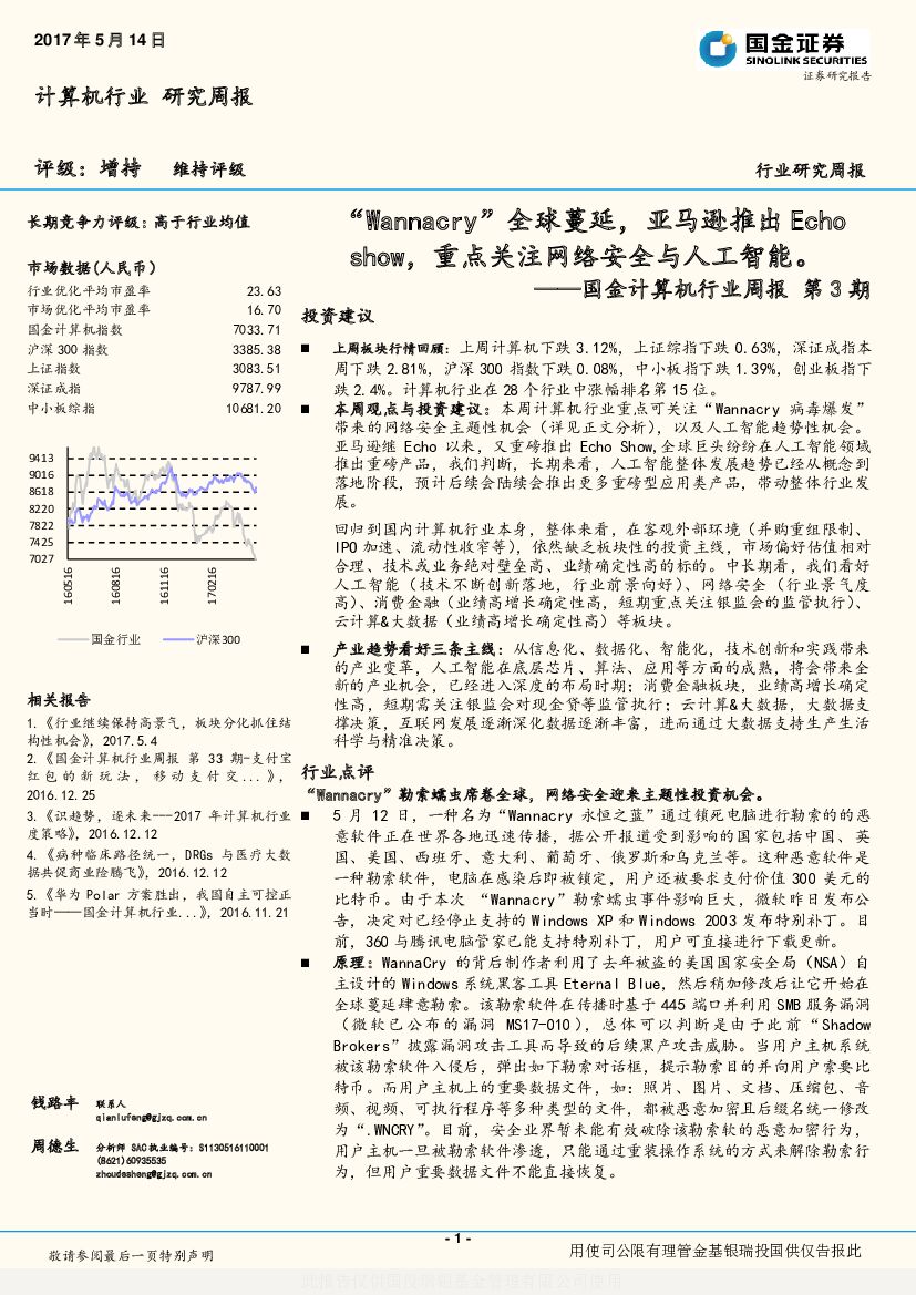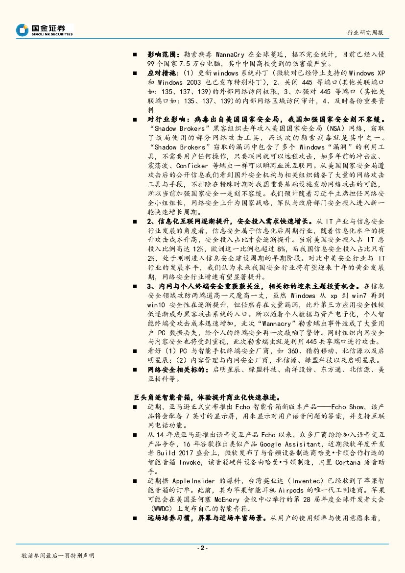 国金证券:国金计算机行业周报第3期:“Wannacry”全球蔓延,亚马逊推出Echoshow,重点关注网络安全与人工智能。.pdf