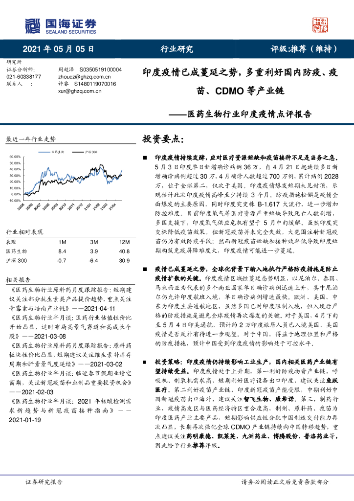 国海证券:医药生物行业印度疫情点评报告:印度疫情已成蔓延之势,多重利好国内防疫、疫苗、CDMO等产业链.pdf