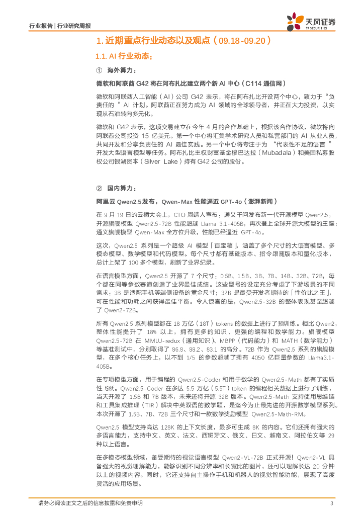 天风证券:通信行业研究周报:微软与阿联酋G42新建2个AI中心;通义千问Qwen2.5各项性能显著提升.pdf
