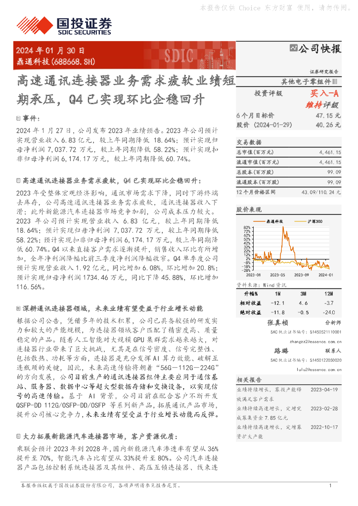国投证券:鼎通科技(688668)-高速通讯连接器业务需求疲软业绩短期承压,Q4已实现环比企稳回升.pdf