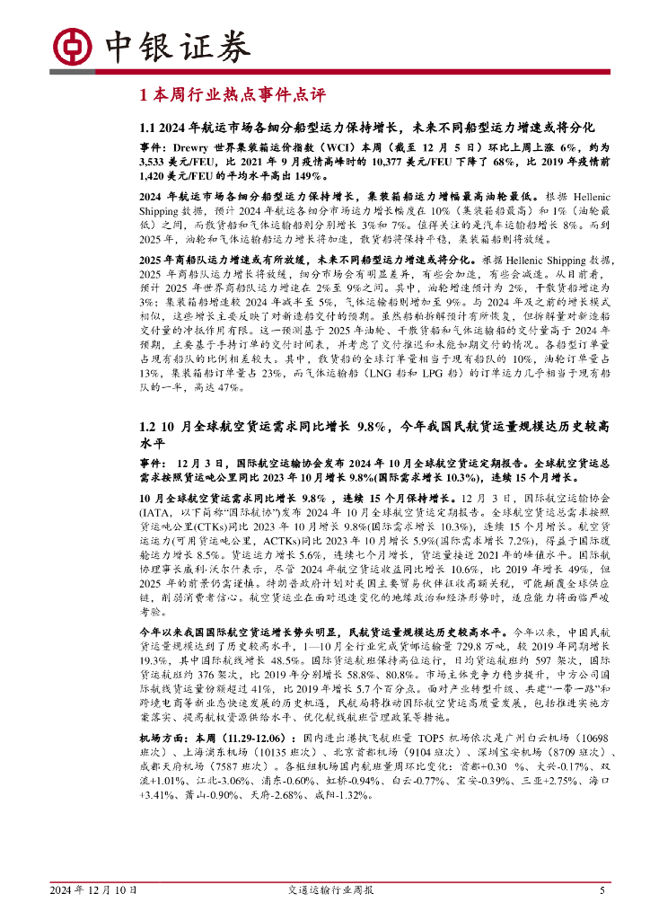 中银证券:交通运输行业周报:2024年航运市场各细分船型运力保持增长,10月全球航空货运需求同比增长9.8%.pdf