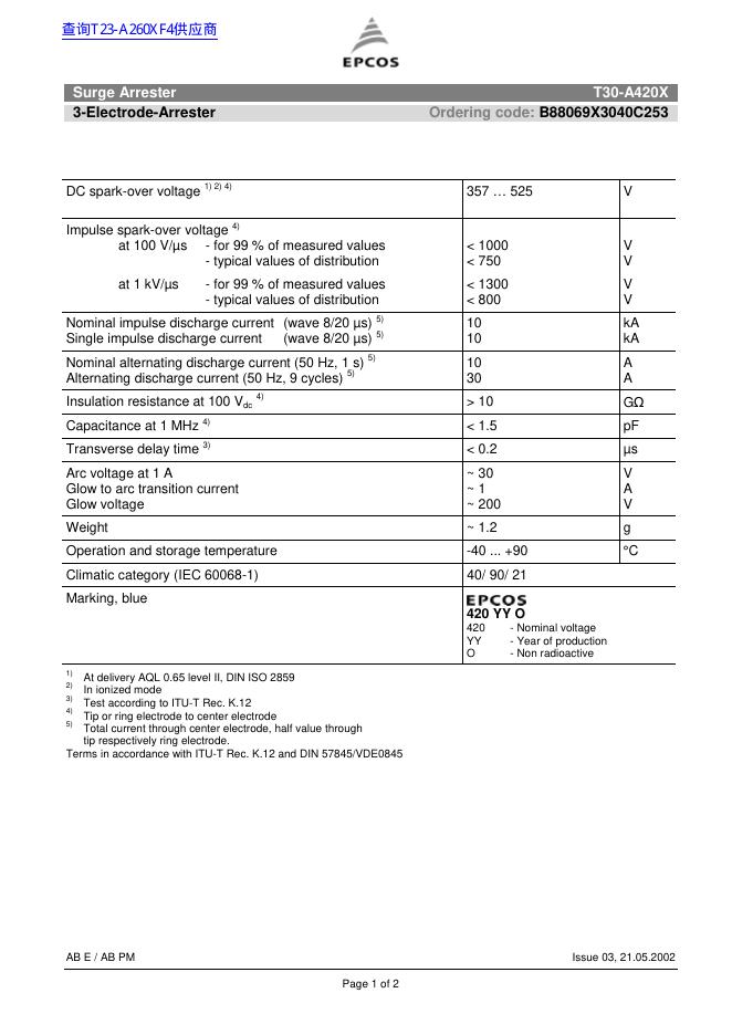 EPCOS Surge Arrester T30-A420X 数据手册.pdf