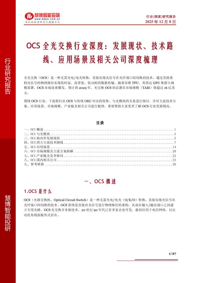慧博智能投研:OCS全光交换行业深度:发展现状、技术路线、应用场景及相关公司深度梳理.pdf