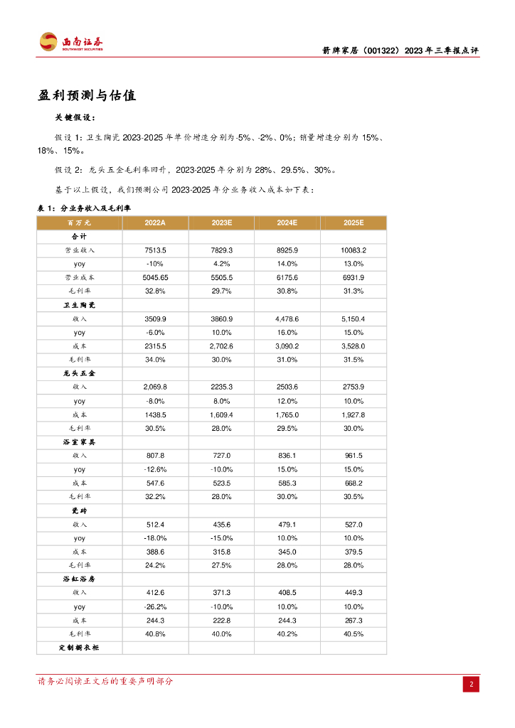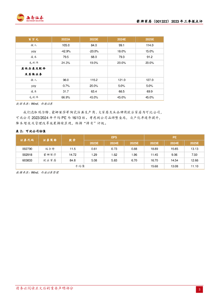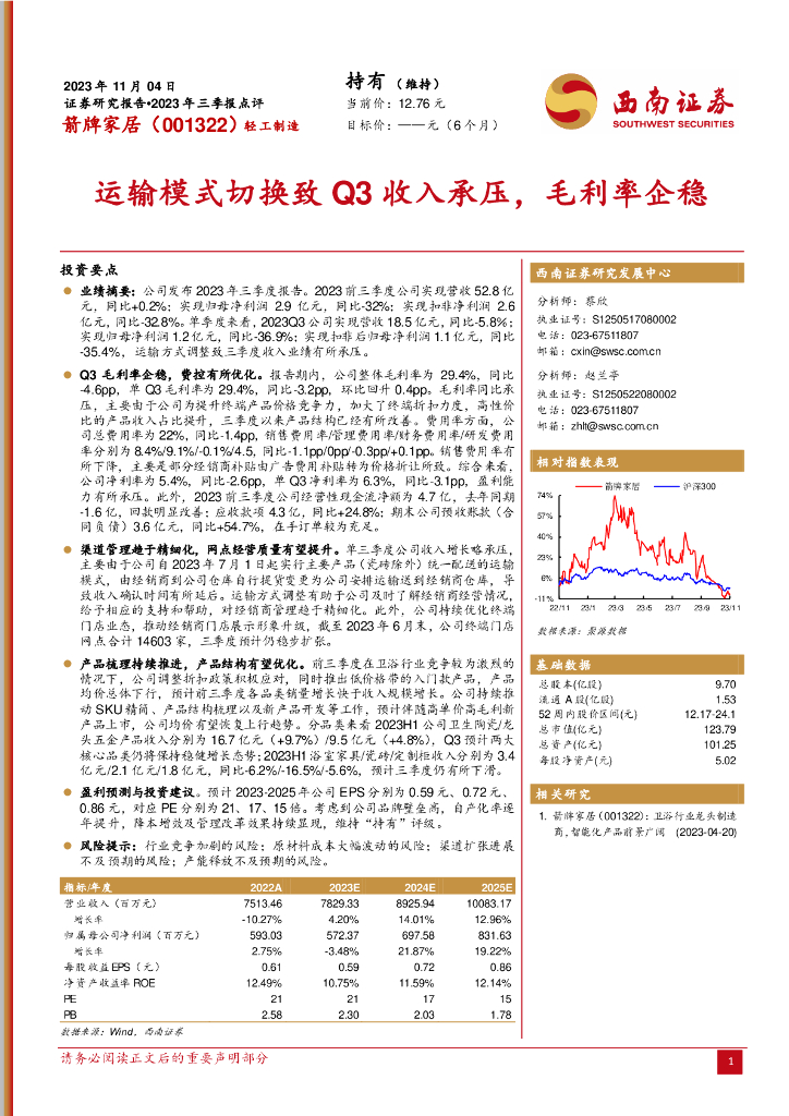 西南证券:箭牌家居(001322)-2023年三季报点评:运输模式切换致Q3收入承压,毛利率企稳.pdf