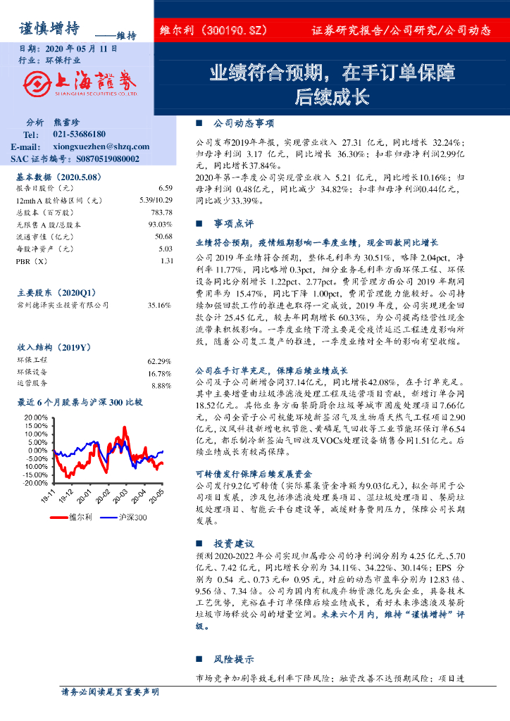 上海证券:维尔利(300190)-业绩符合预期,在手订单保障后续成长.pdf