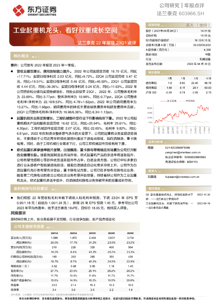 东方证券:法兰泰克22年报及23Q1点评:工业起重机龙头,看好双重成长空间.pdf