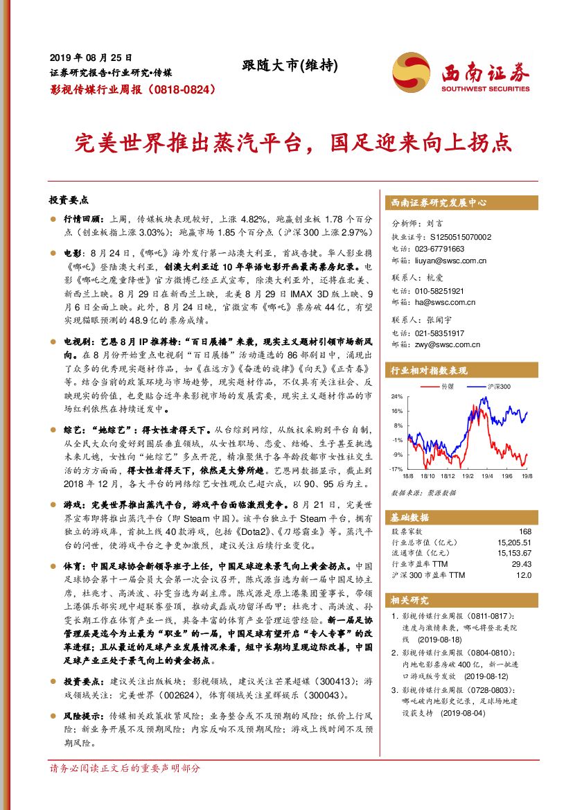 西南证券:影视传媒行业周报:完美世界推出蒸汽平台,国足迎来向上拐点.pdf
