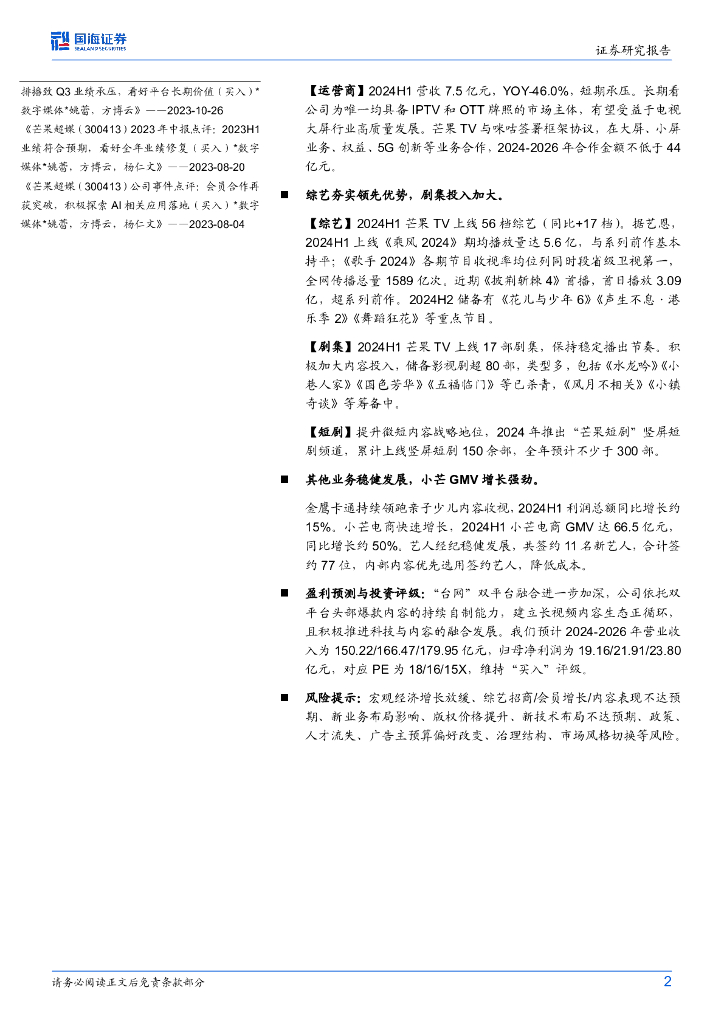 国海证券:芒果超媒(300413)-2024H1业绩点评:营业利润稳健,会员业务获突破,内容加大投入.pdf