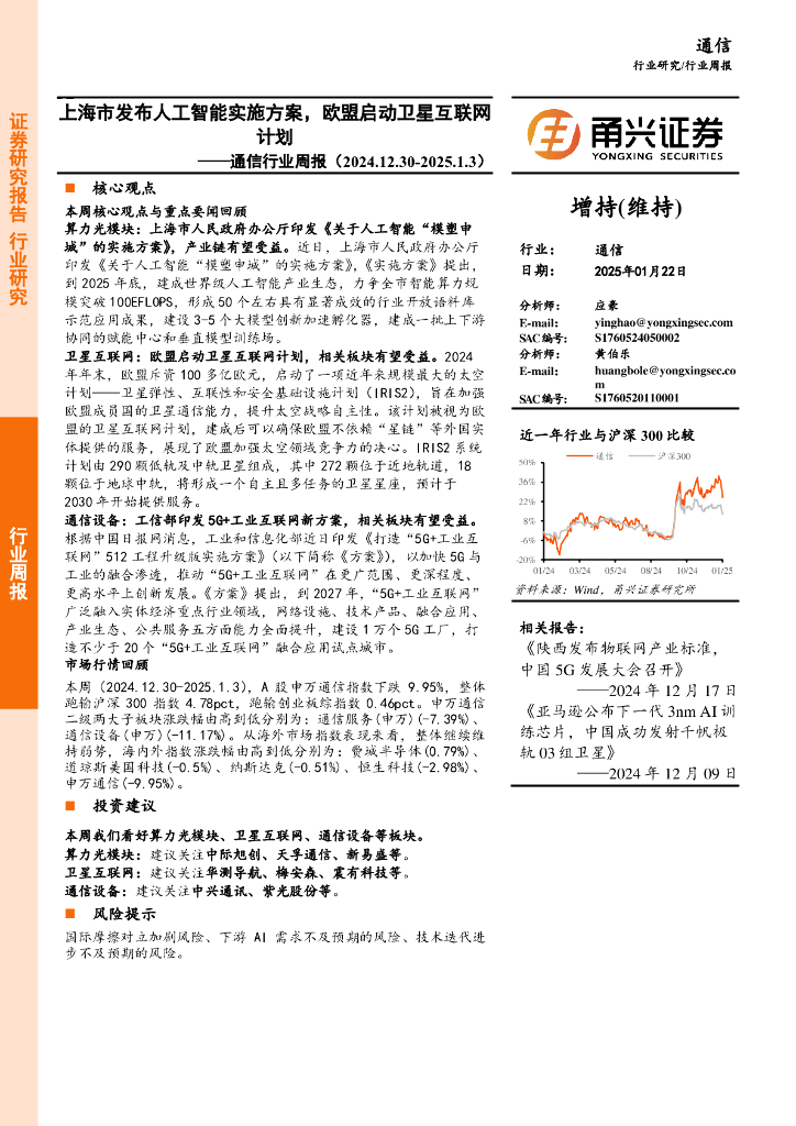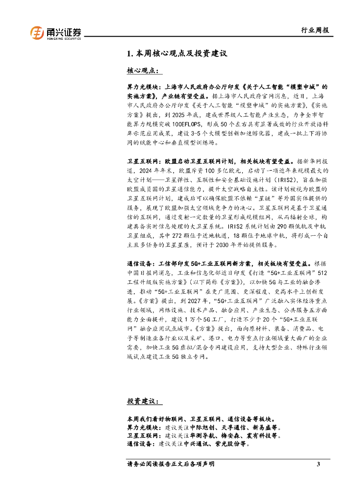 甬兴证券:通信行业周报:上海市发布人工智能实施方案,欧盟启动卫星互联网计划.pdf