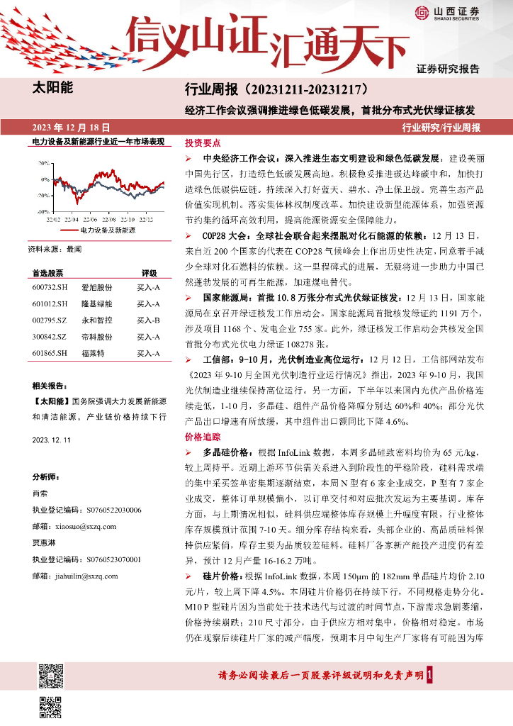 山西证券:太阳能行业周报:经济工作会议强调推进绿色低碳发展,首批分布式光伏绿证核发.pdf