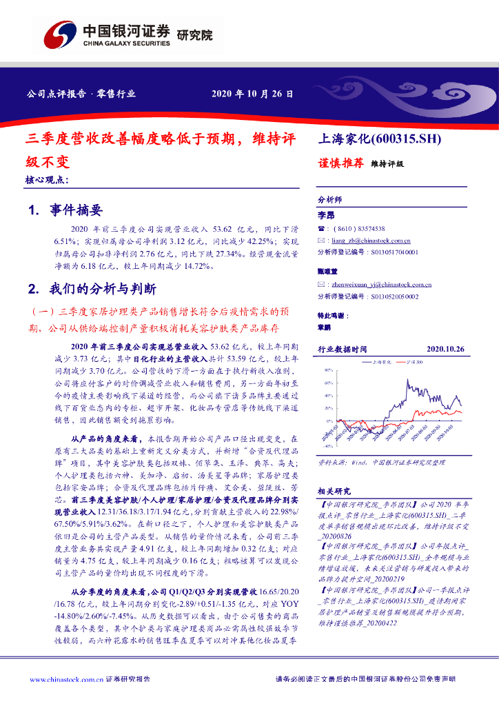 中国银河:上海家化(600315)-三季度营收改善幅度略低于预期,维持评级不变.pdf