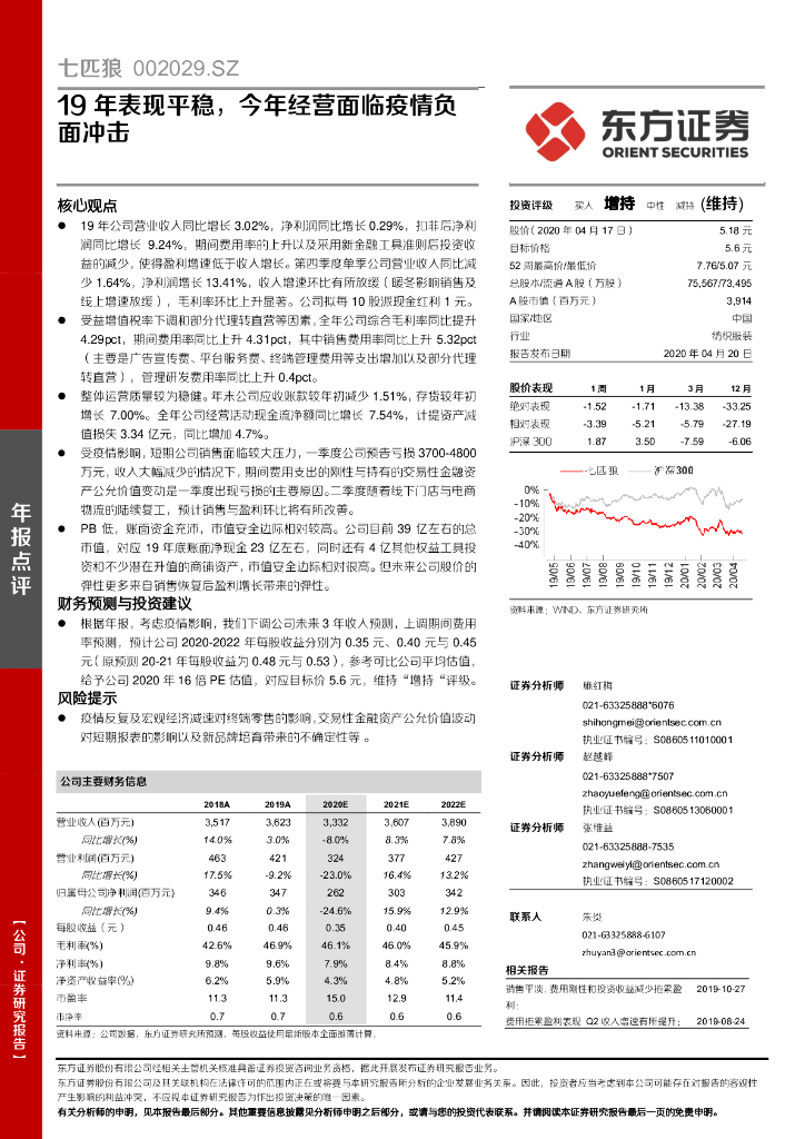 东方证券:七匹狼(002029)-19年表现平稳,今年经营面临疫情负面冲击.pdf