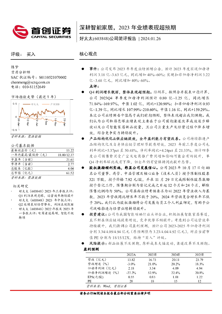 首创证券:好太太(603848)-公司简评报告:深耕智能家居,2023年业绩表现超预期.pdf