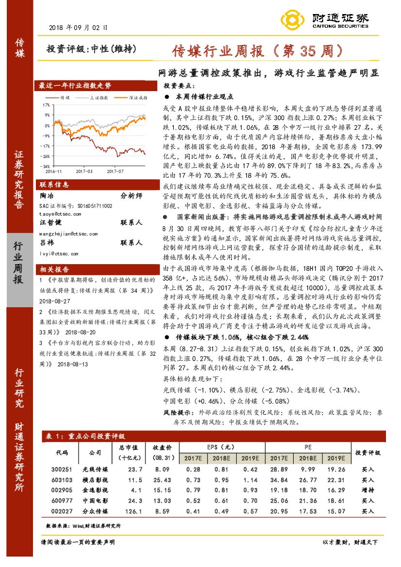 财通证券:传媒行业周报(第35周):网游总量调控政策推出,游戏行业监管趋严明显.pdf