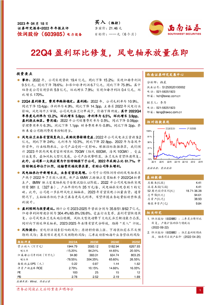西南证券:恒润股份(603985)-22Q4盈利环比修复,风电轴承放量在即.pdf