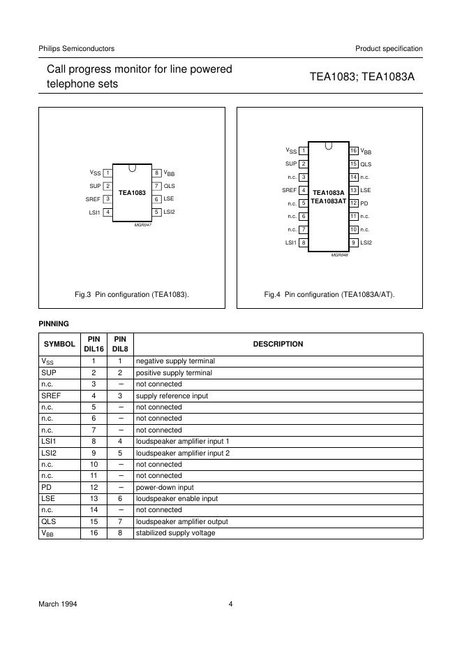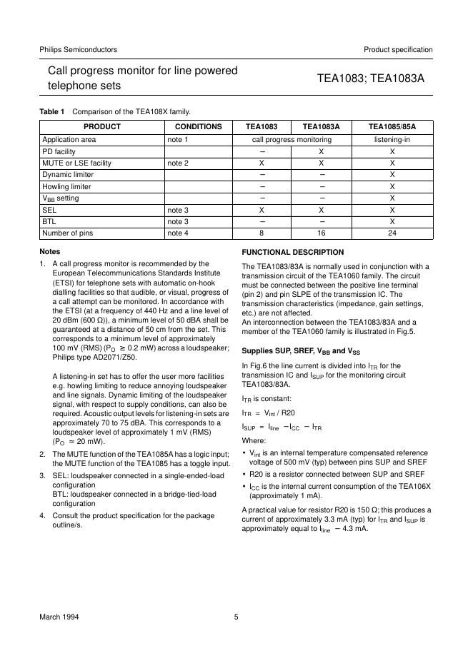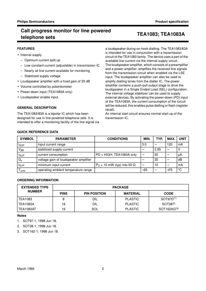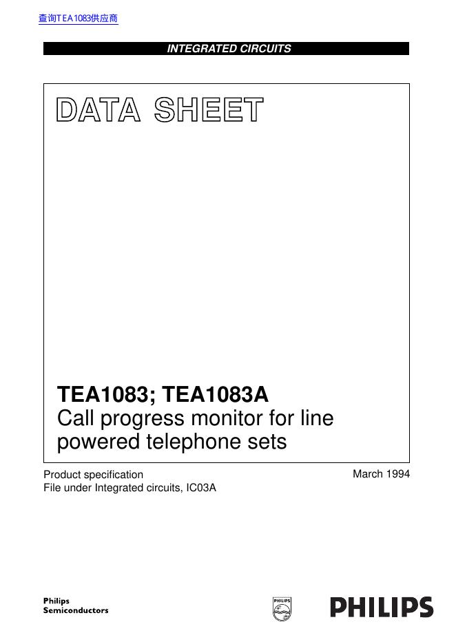 PHILIPS TEA1083; TEA1083A Call progress monitor for line powered telephone sets 数据手册.pdf