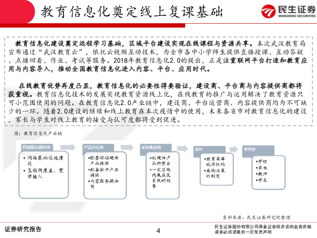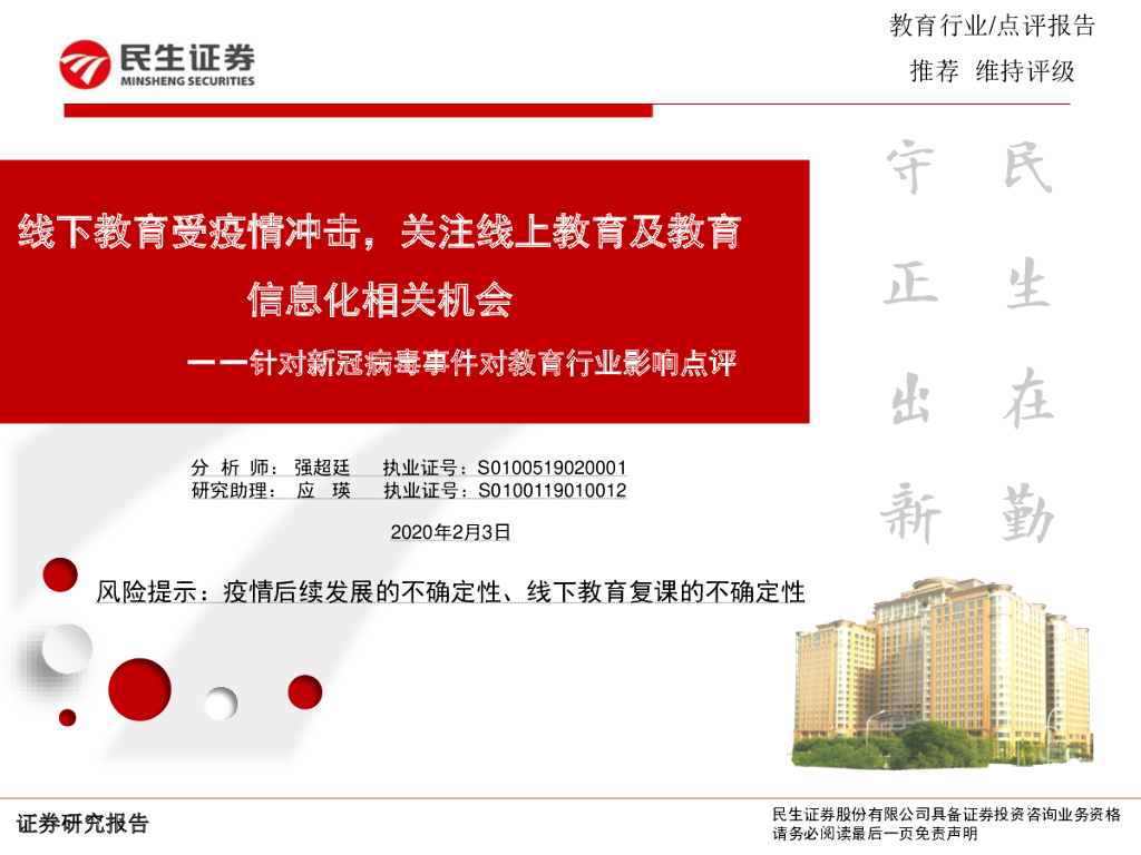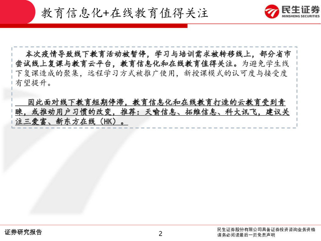 民生证券:针对新冠病毒事件对教育行业影响点评:线下教育受疫情冲击,关注线上教育及教育信息化相关机会.pdf