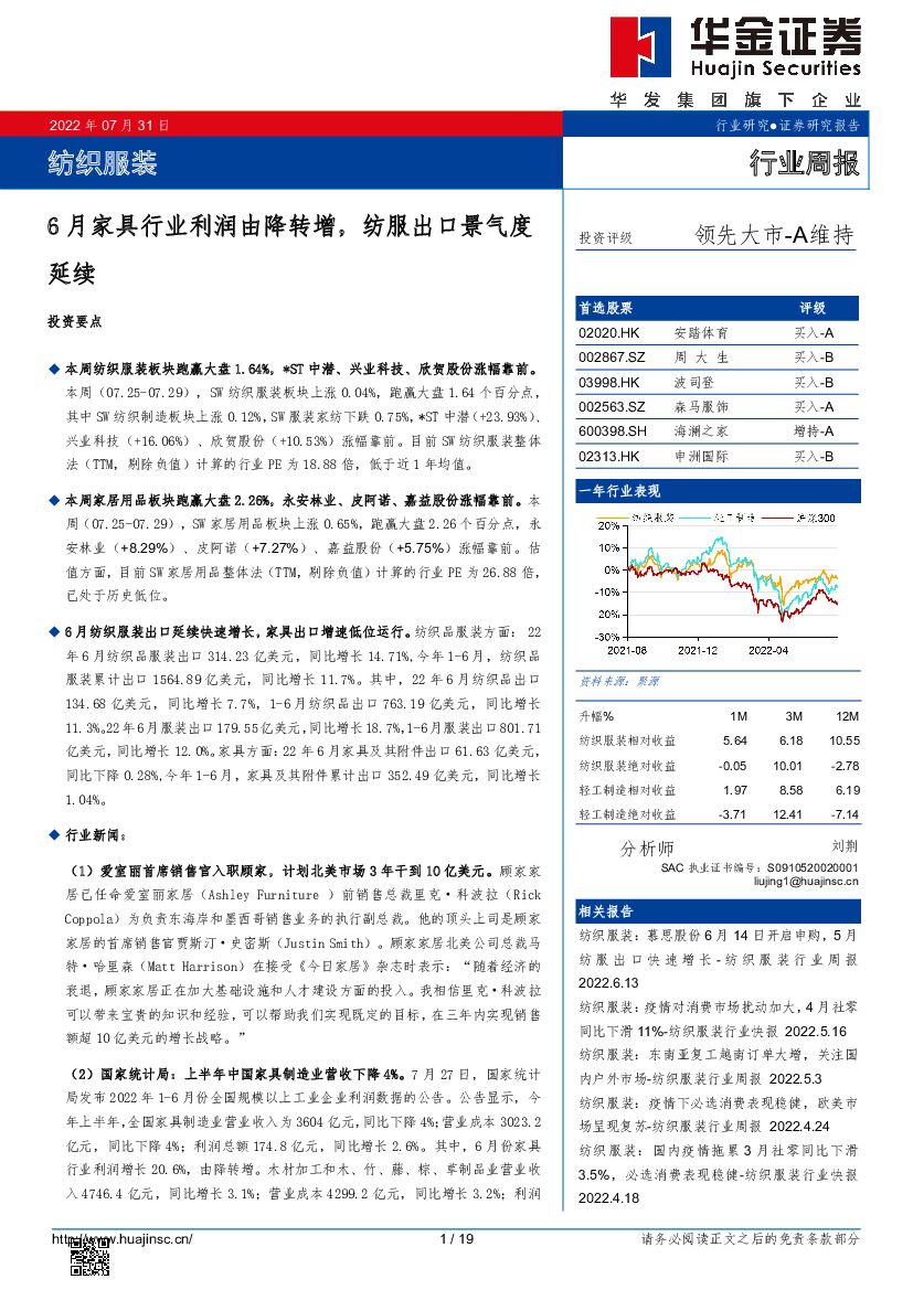 华金证券:纺织服装行业周报:6月家具行业利润由降转增,纺服出口景气度延续.pdf