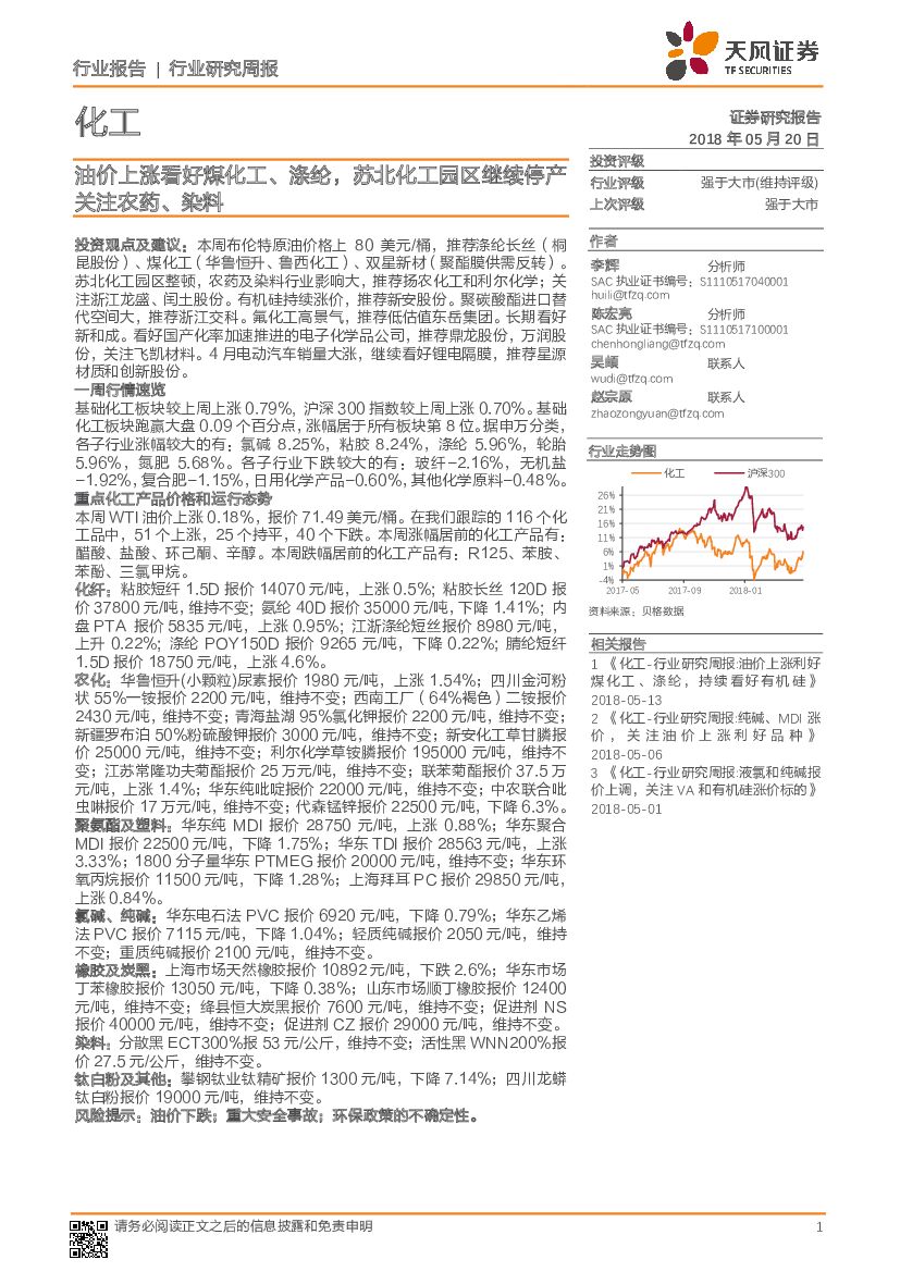 天风证券:化工行业研究周报:油价上涨看好煤化工、涤纶,苏北化工园区继续停产关注农药、染料.pdf