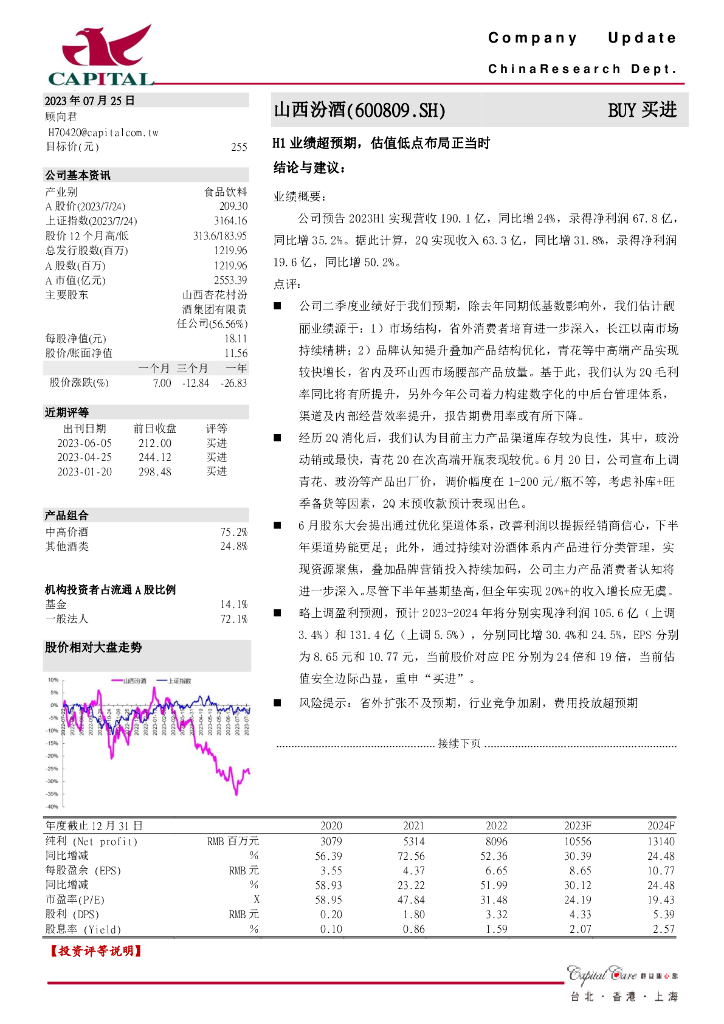 群益证券:山西汾酒(600809)-H1业绩超预期,估值低点布局正当时.pdf