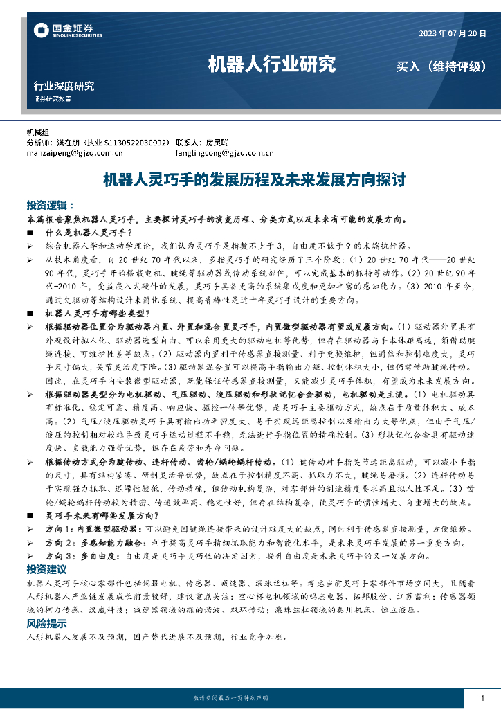国金证券:机器人行业研究:机器人灵巧手的发展历程及未来发展方向探讨.pdf