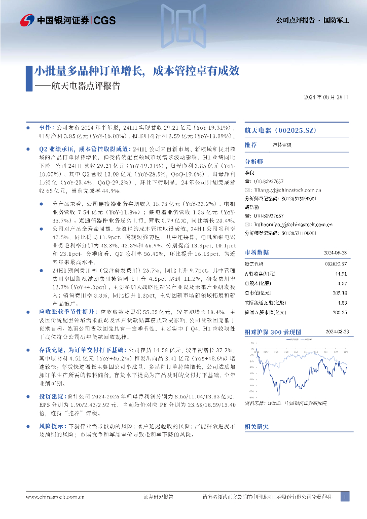 中国银河:航天电器点评报告:小批量多品种订单增长,成本管控卓有成效.pdf
