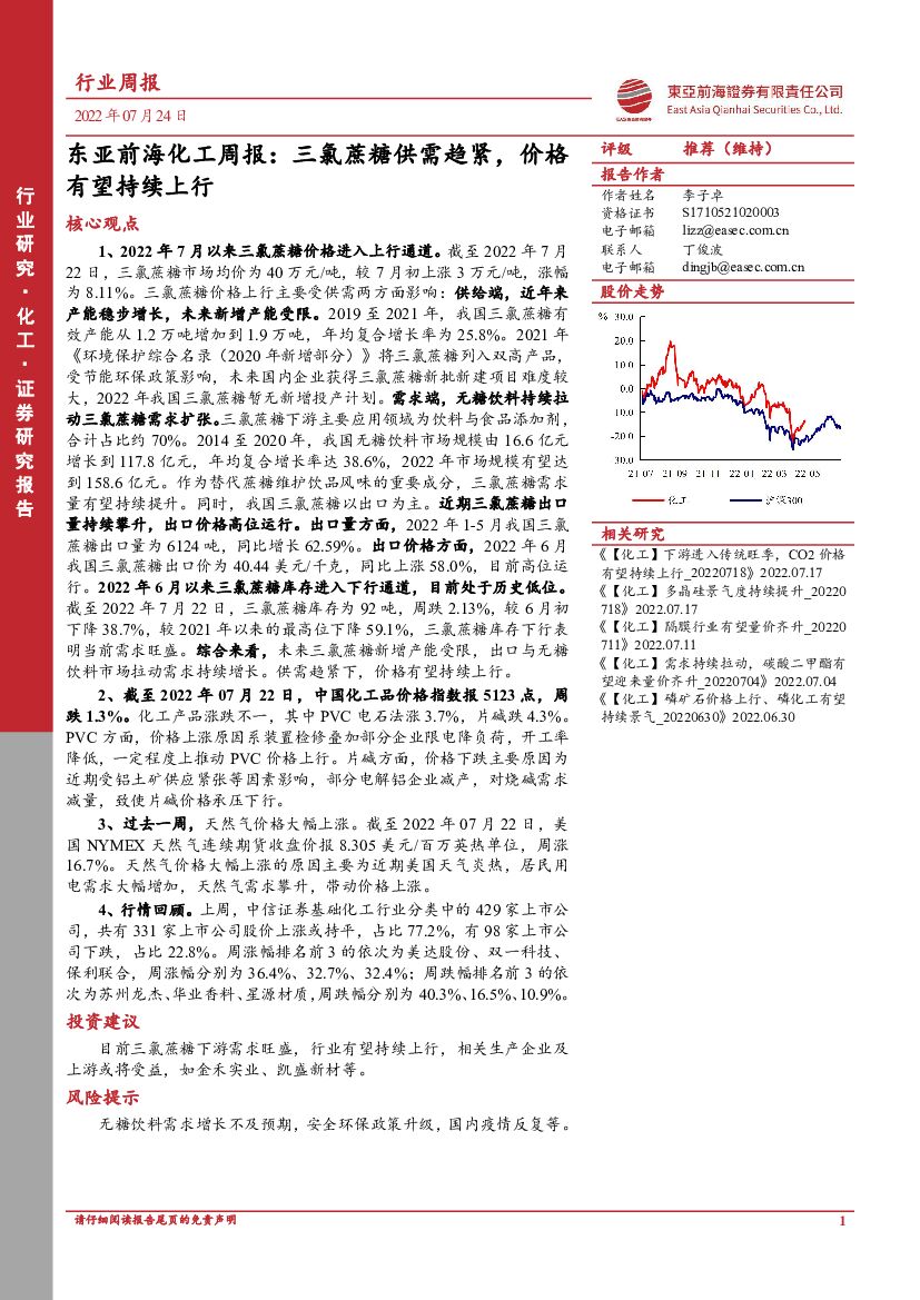 东亚前海证券:东亚前海化工周报:三氯蔗糖供需趋紧,价格有望持续上行.pdf