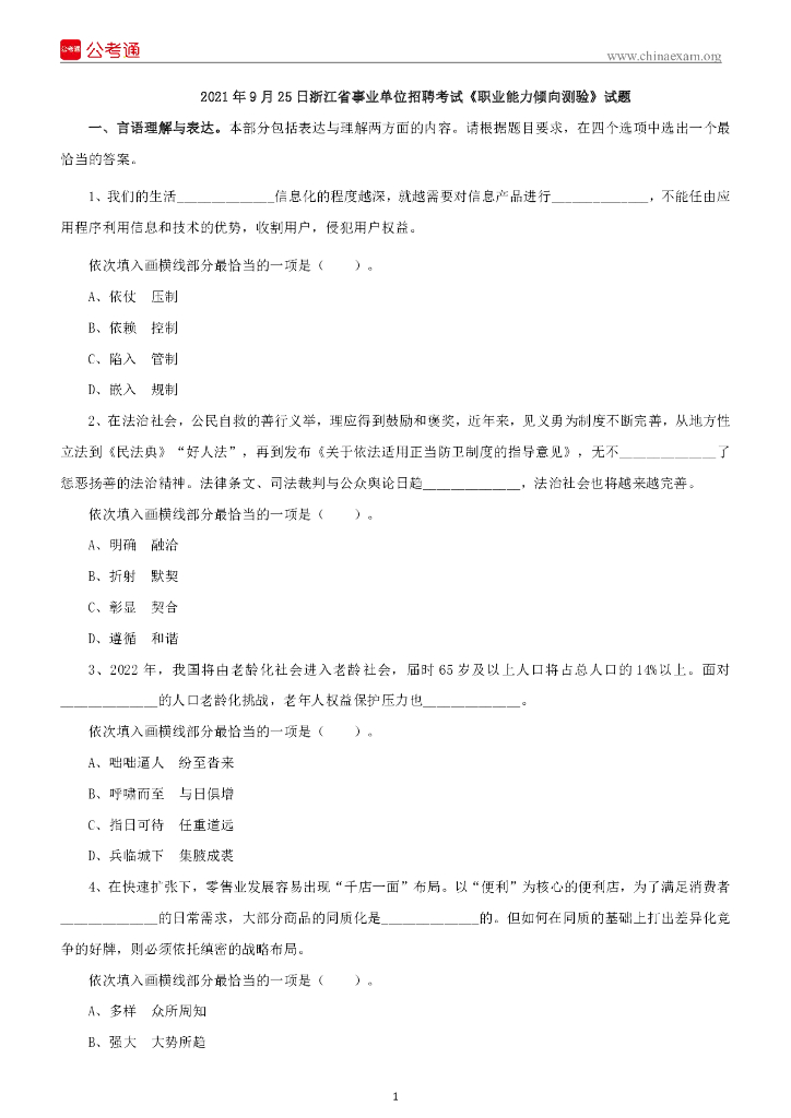 2021年9月25日浙江省事业单位招聘考试《职业能力倾向测验》试题.pdf