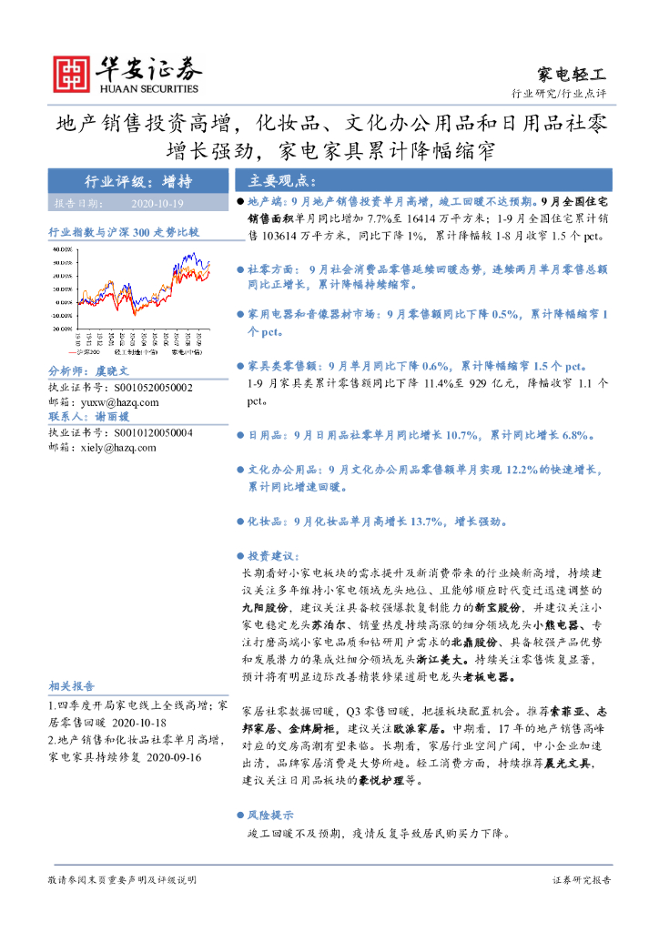 华安证券:家电轻工行业点评:地产销售投资高增,化妆品、文化办公用品和日用品社零增长强劲,家电家具累计降幅缩窄.pdf