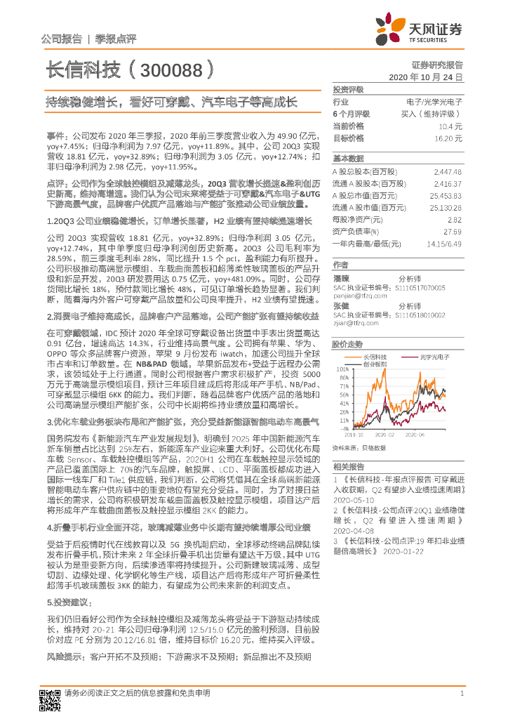 天风证券:长信科技(300088)-持续稳健增长,看好可穿戴、汽车电子等高成.pdf