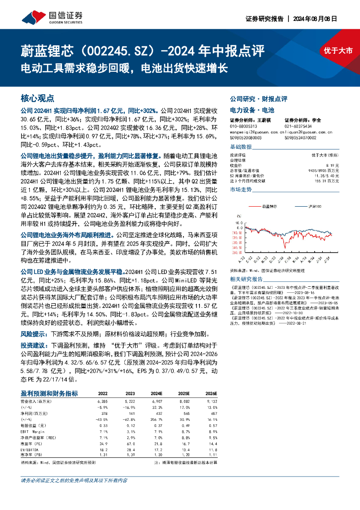 国信证券:蔚蓝锂芯(002245)-2024年中报点评:电动工具需求稳步回暖,电池出货快速增长.pdf