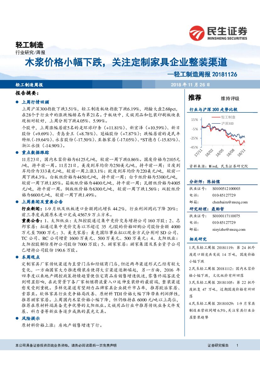 民生证券:轻工制造周报:木浆价格小幅下跌,关注定制家具企业整装渠道.pdf