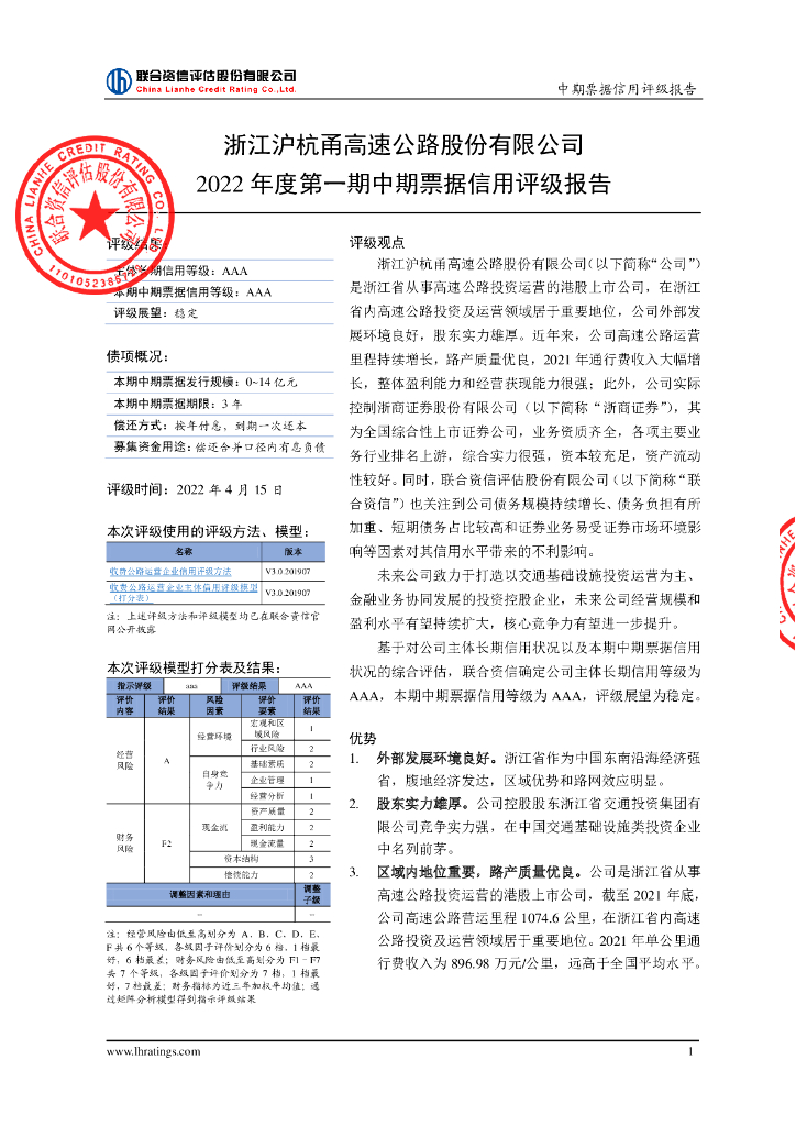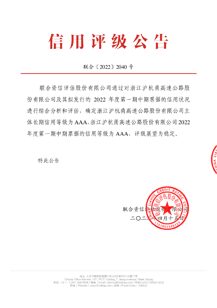 联合资信:浙江沪杭甬高速公路股份有限公司2022年度第一期中期票据信用评级报告.pdf