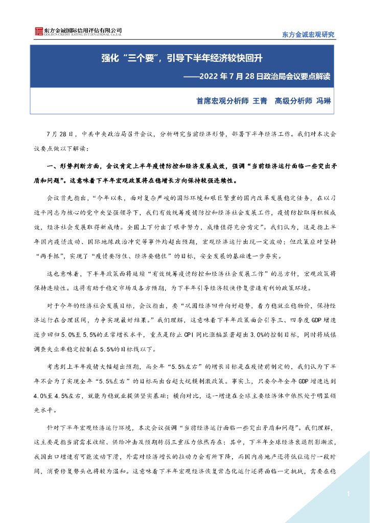 东方金诚:强化“三个要”,引导下半年经济较快回升-7月28日政治局会议要点解读.pdf