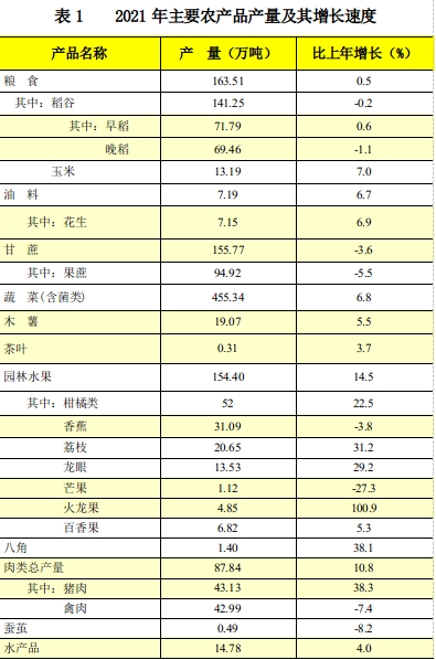 全年全市油料产量7.19万吨,比上年增长6.7%。甘蔗产量155.77万吨,下降3.6%。蔬菜产量(含食用菌)455.34万吨,增长6.8%。园林水果产量154.40万吨,增长14.5%。