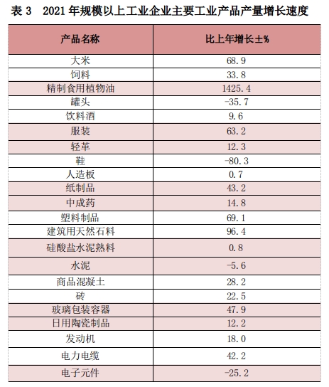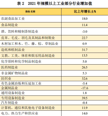 2021年,规模以上工业增加值比上年增长11.4%,其中,国有控股企业增长13.4%,外商及港澳台投资企业增长5.3%,股份制企业增长15.8%,集体企业下降24.7%,民营企业增长13.1%。分轻重工业看,轻工业增长19.4%,重工业增长8.3%。分门类看,采矿业比上年增长35.4%,制造业增长10.2%,电力、热力、燃气及水生产和供应业增长15.1%。