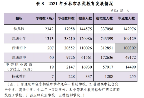 全年全市普通高等教育招生数0.76万人,在校学生2.27万人,毕业生0.47万人,专任教师1313人。玉林市义务教育巩固率为 102.33 %,高中阶段毛入学率为 95.73%。