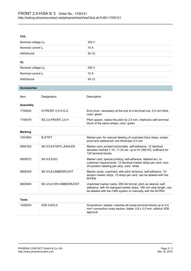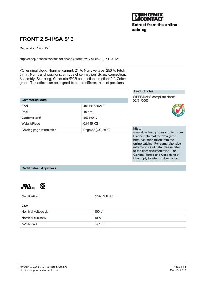 PHOENIX CONTACT FRONT 2,5-H/SA 5/ 3 Order No.: 1700121 数据手册.pdf