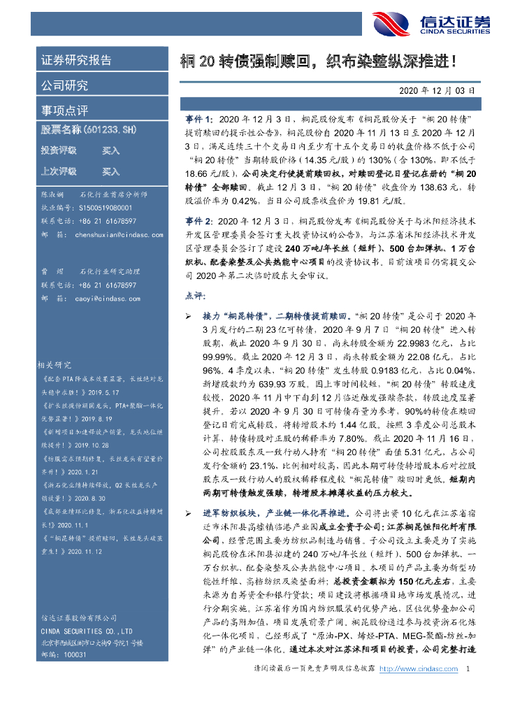 信达证券:桐昆股份(601233)-桐20转债强制赎回,织布染整纵深推进!.pdf